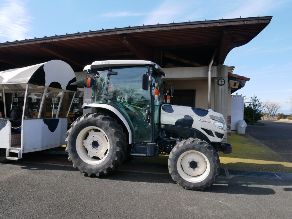 ▼牧場内をぐるりと一周回れる牛柄のトラクターバス
