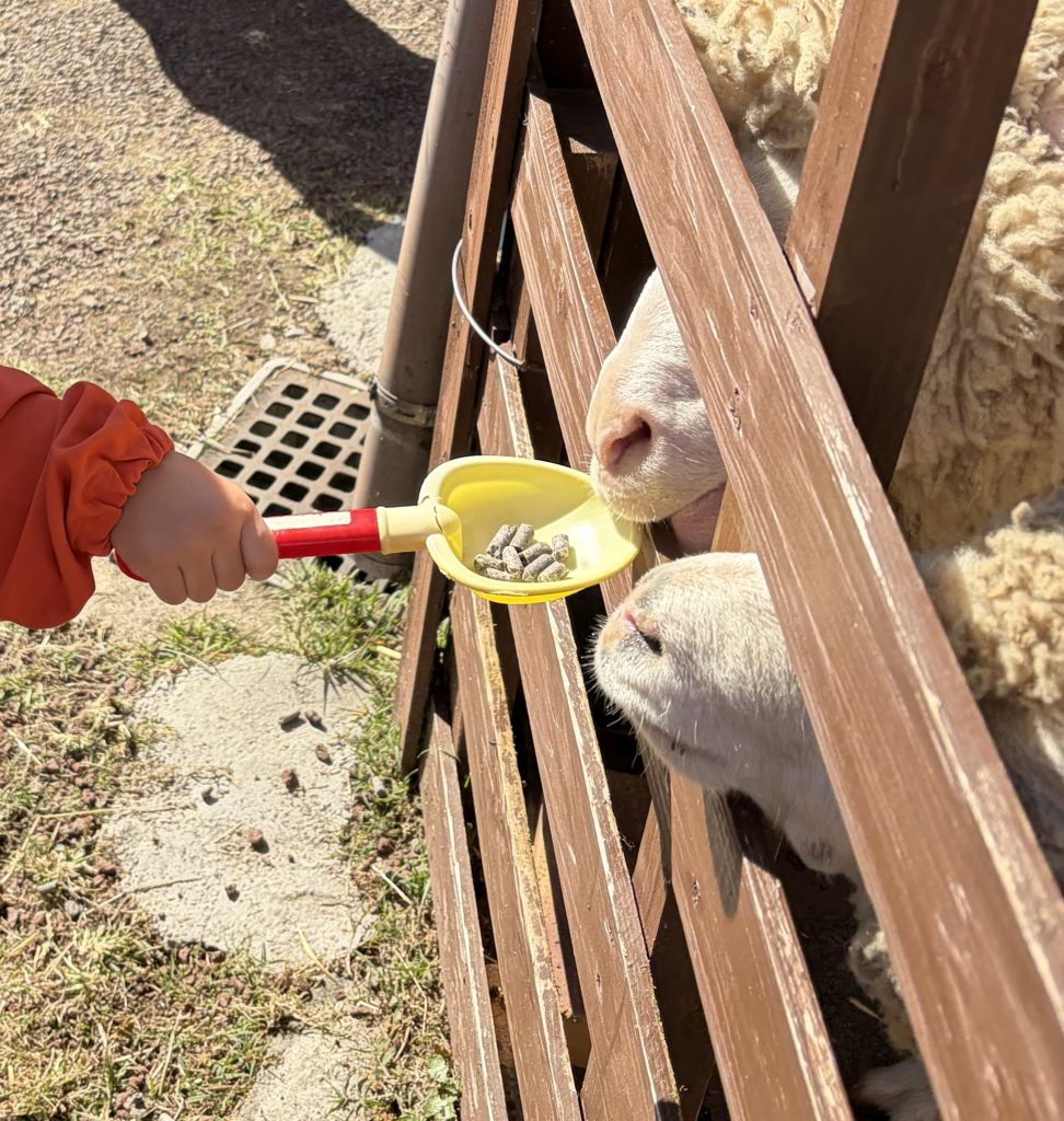 施設内ではヤギやヒツジにエサやり体験ができます!エサは別料金1回200円(2025年11月時点)かかります。